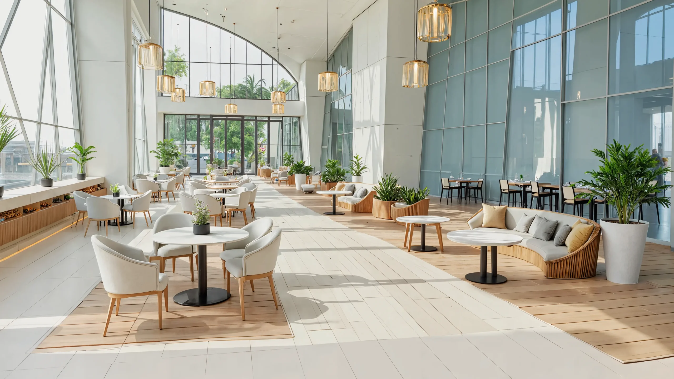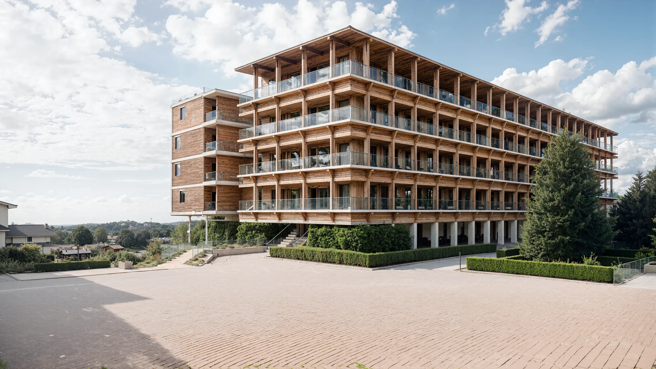 We visualized several indoor and outdoor perspectives. The base was a CAD/BIM model, from which we took simple screenshots as input. Everything else, the lighting, realistic materials for all surfaces, exterior surroundings including vegetation, and the sky, was iteratively generated using our AI workflows. As options and to provide more flexibility in presentation, we also created several non-realistic style variations.