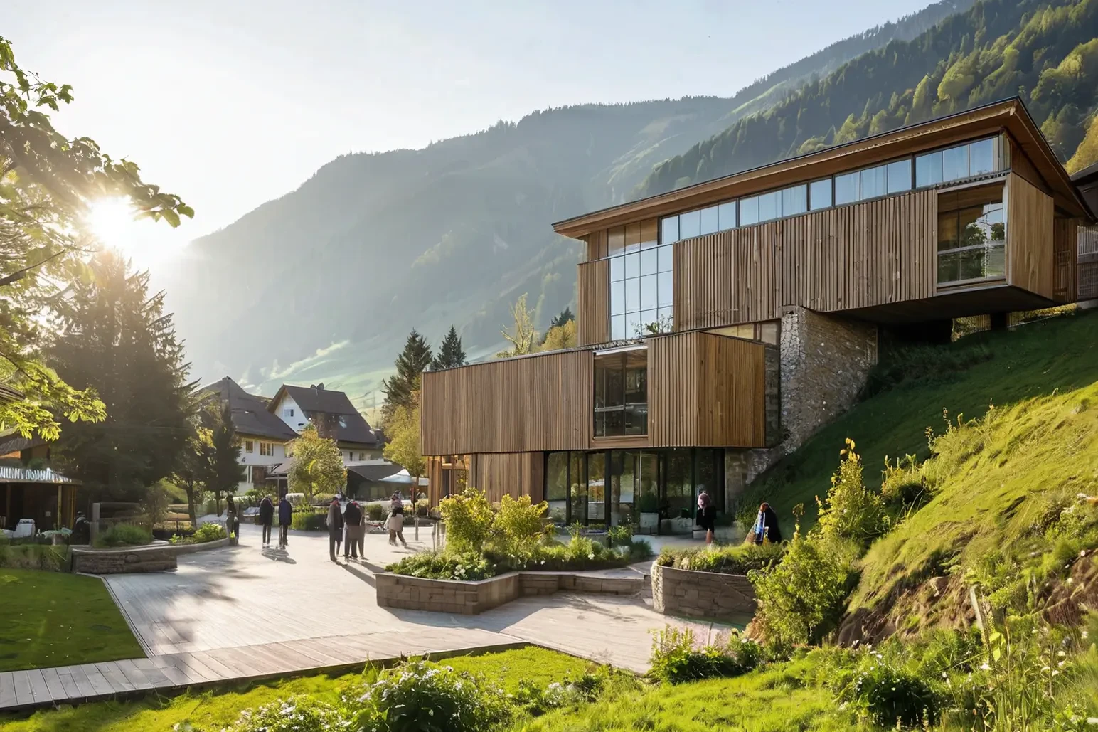 We visualized several indoor and outdoor perspectives. The base was a CAD/BIM model, from which we took simple screenshots as input. Everything else, the lighting, realistic materials for all surfaces, exterior surroundings including vegetation, and the sky, was iteratively generated using our AI workflows. As options and to provide more flexibility in presentation, we also created several non-realistic style variations.